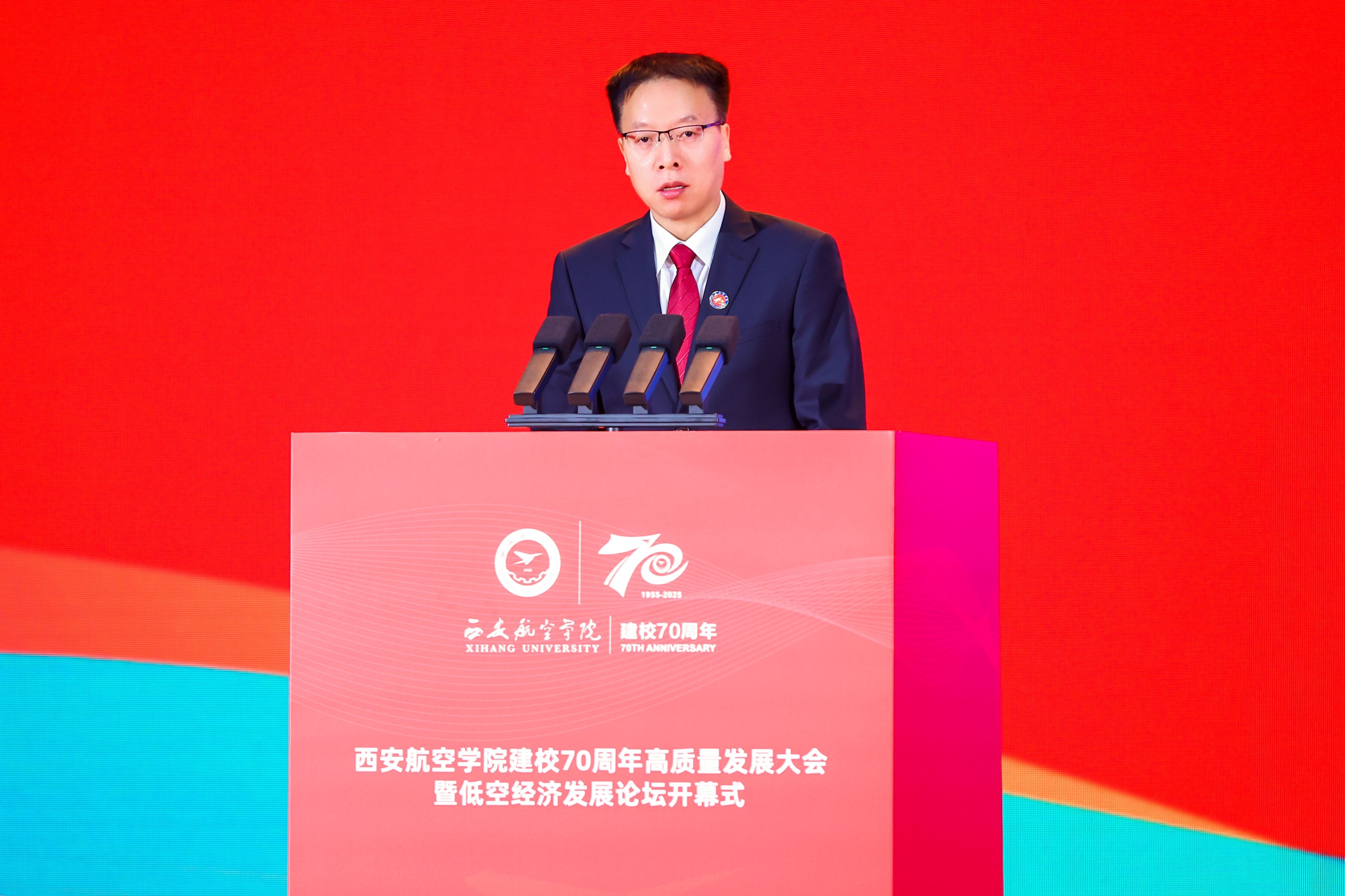10月15日上午,西安航空学院建校70周年高质量发展大会暨低空经济发展论坛开幕式在学校阎良校区隆重召开。陕西省人民政府副省长李钧,中国航空工业集团有限公司党组副书记、董事李清堂,中国科学院院士、西北工业大学教授张卫红,中共陕西省委副秘书长王利,陕西省人民政府副秘书长徐刚,中共陕西省委教育工委书记、省教育厅厅长王树声,国防科工局科技司辜坚,中国航发西安航空发动机有限公司党委副书记唐宏伟,中国商飞上海飞机制造有限公司党委副书记曹印诺出席会议,省市有关领导、院士专家、兄弟高校、合作单位嘉宾,海内外校友以及学校师生代表等1300余人参加大会。西安航空学院党委书记祁玉龙主持会议。